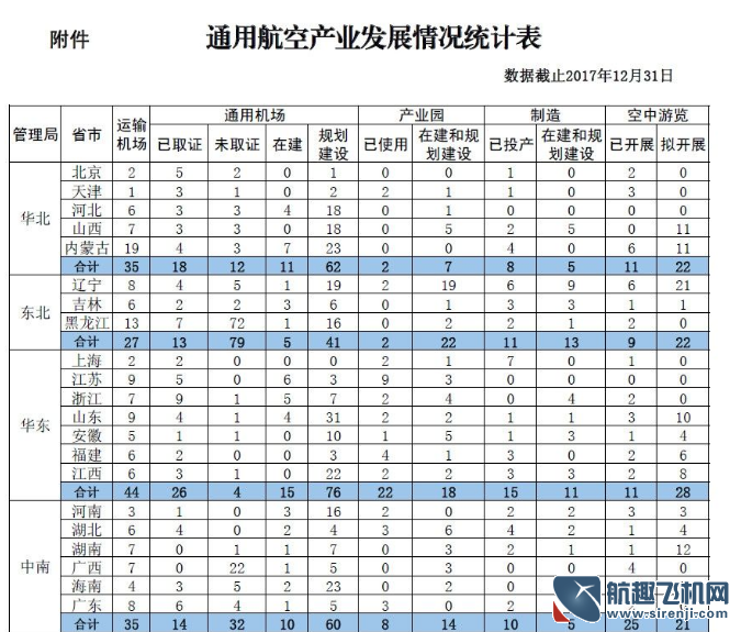 为落实国务院办公厅《关于促进通用航空业发展的指导意见》,扎实推进各项任务,全面掌握各地通用航空产业规划建设情况,经各地区管理局、监管局与辖区内地方政府相关部门确认,对通用航空业发展和规划布局基本情况进行了全面摸底,包括可供通用航空起降的机场(运输和通用机场)、航空产业园(含通航项目)、航空小镇、空中游览项目,现将相关信息汇总发布,供各地方、各部门及各类投资主体借鉴参考。
