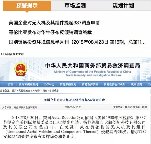 Robotics公司依据《美国1930年关税法》第337节规定向美国际贸易委员会(ITC)提出申请,指控深圳市大疆创新科技有限公司及其关联公司(以下统称大疆)对美出口、在美进口或在美销售的无人机及其组件(Unmanned